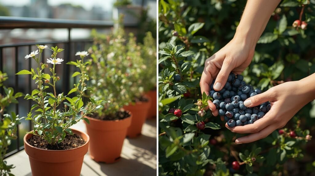 “Split image showing blueberry container gardening: left side shows blueberry plants growing in pots on a sunny balcony with flowers, right side shows ripe blueberries being harvested from potted plants, realistic home gardening style, natural lighting, high detail”